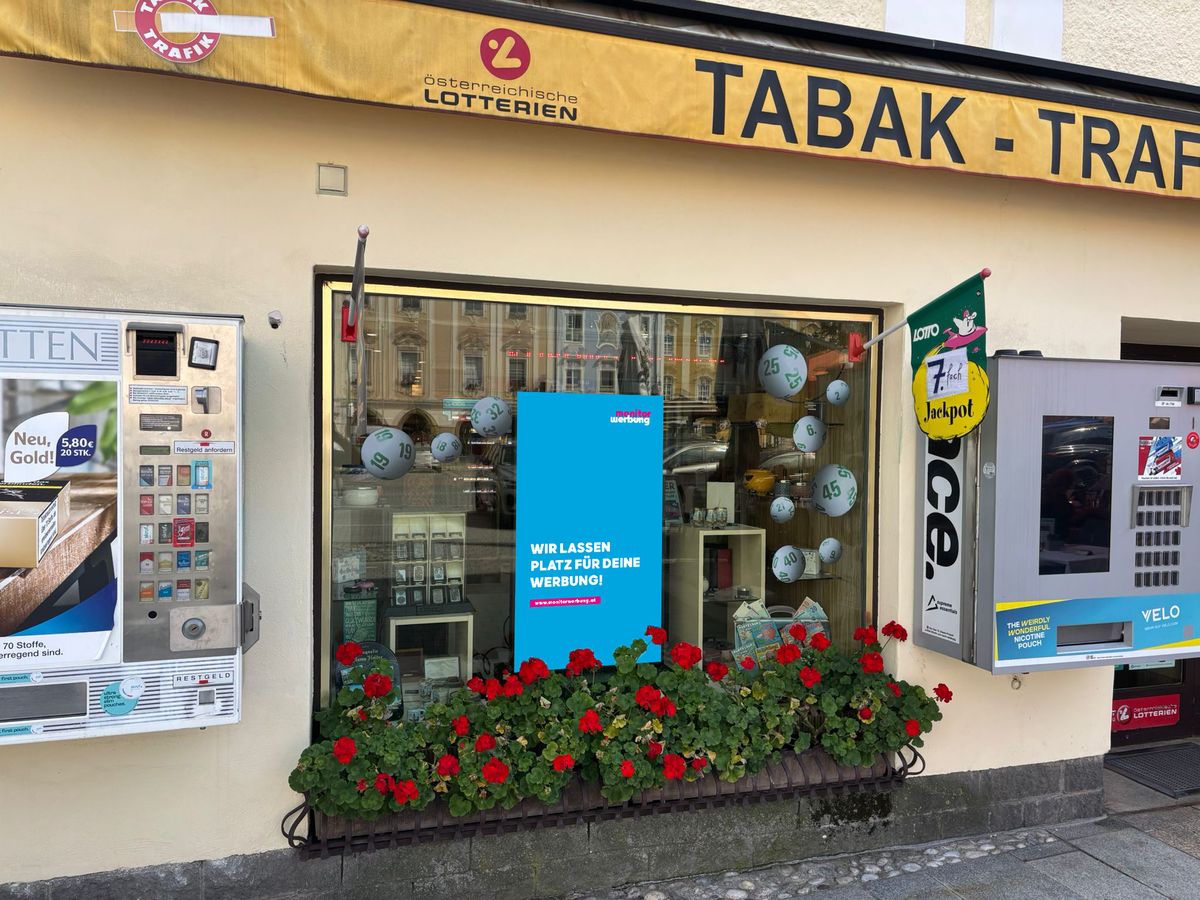 Semi-Outdoorscreen bei der Trafik – optimal positioniert, um vorbeigehende Fußgänger direkt und wirkungsvoll anzusprechen.