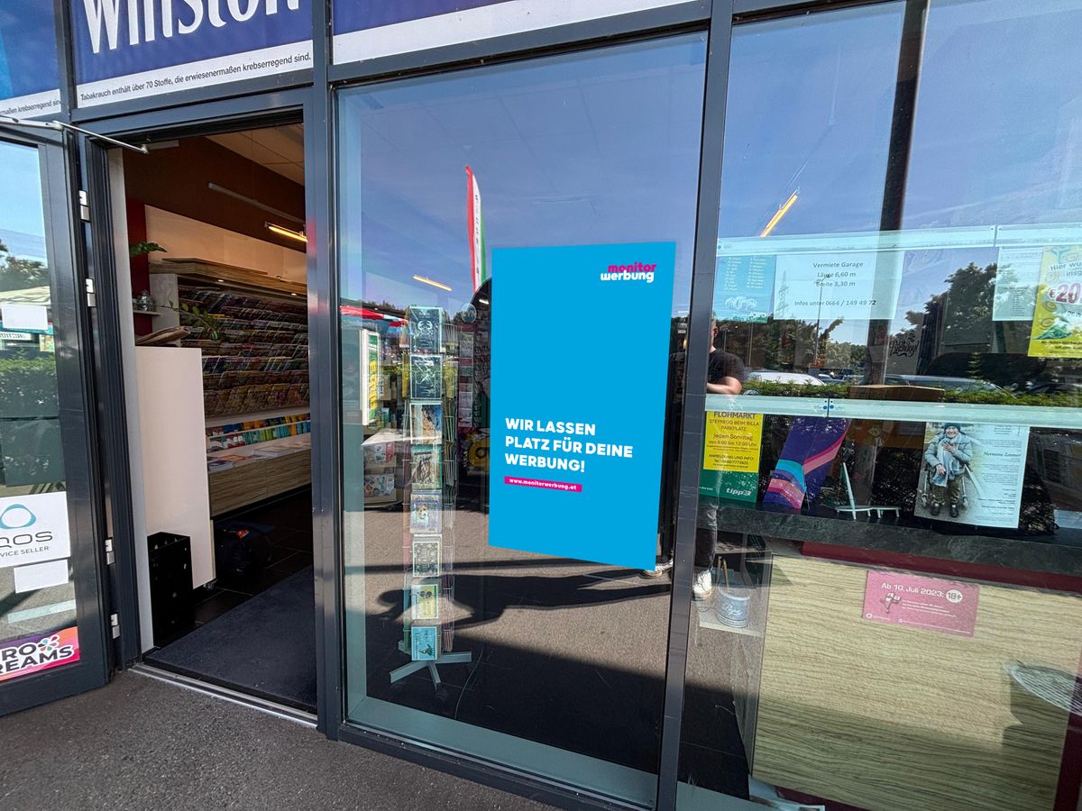 Semi-Outdoorscreen bei der Trafik – optimal positioniert, um vorbeigehende Fußgänger direkt und wirkungsvoll anzusprechen.