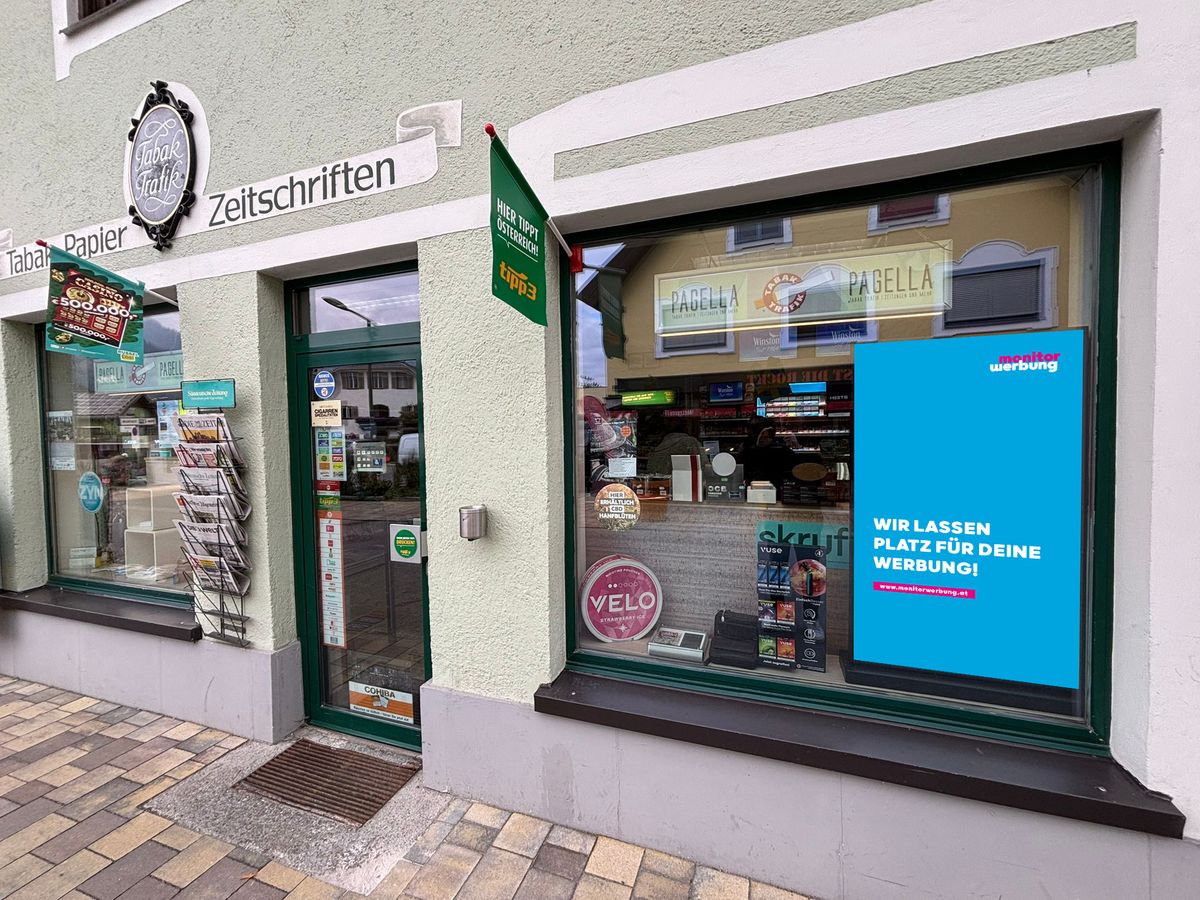 Semi-Outdoorscreen bei der Trafik – optimal positioniert, um vorbeigehende Fußgänger direkt und wirkungsvoll anzusprechen.