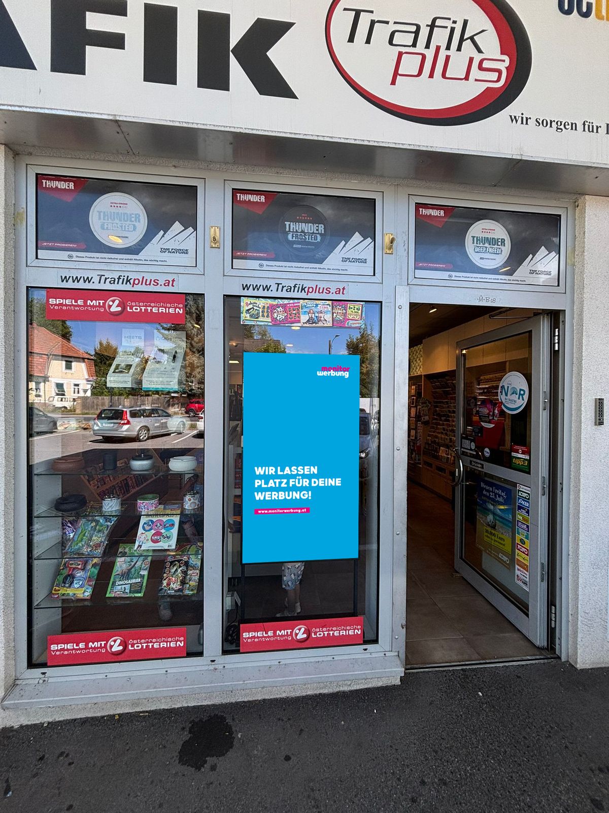 Semi-Outdoorscreen bei der Trafik – optimal positioniert, um vorbeigehende Fußgänger direkt und wirkungsvoll anzusprechen.