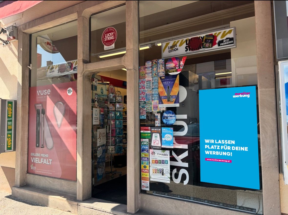 Semi-Outdoorscreen bei der Trafik – optimal positioniert, um vorbeigehende Fußgänger direkt und wirkungsvoll anzusprechen.