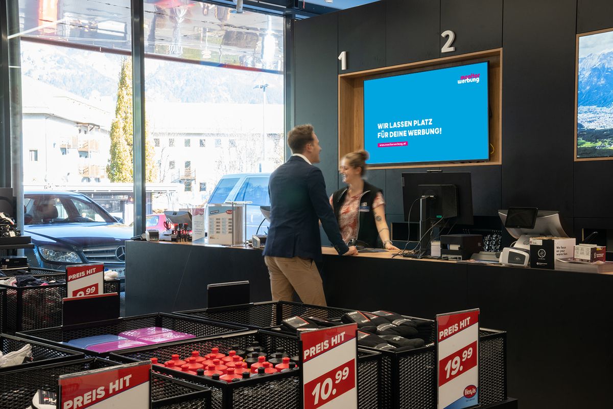 Die Screens befinden sich verteilt über die Hervis-Filiale.
