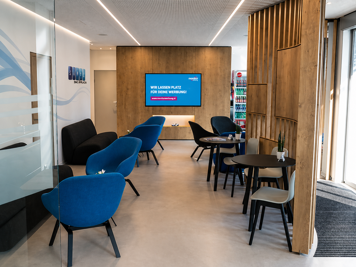 Screen im Aufenthaltsbereich der Fahrschule.