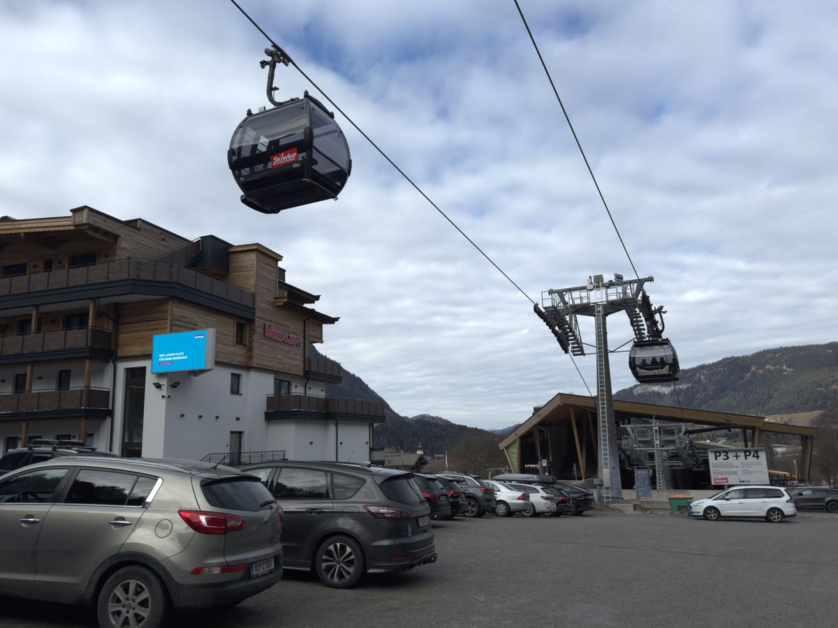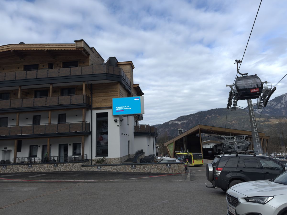 Doppelseitige LED Wall direkt an der Talstation in Söll - ausgezeichnet sichtbar von der Gondel und vom Parkplatz an der Bergbahn.