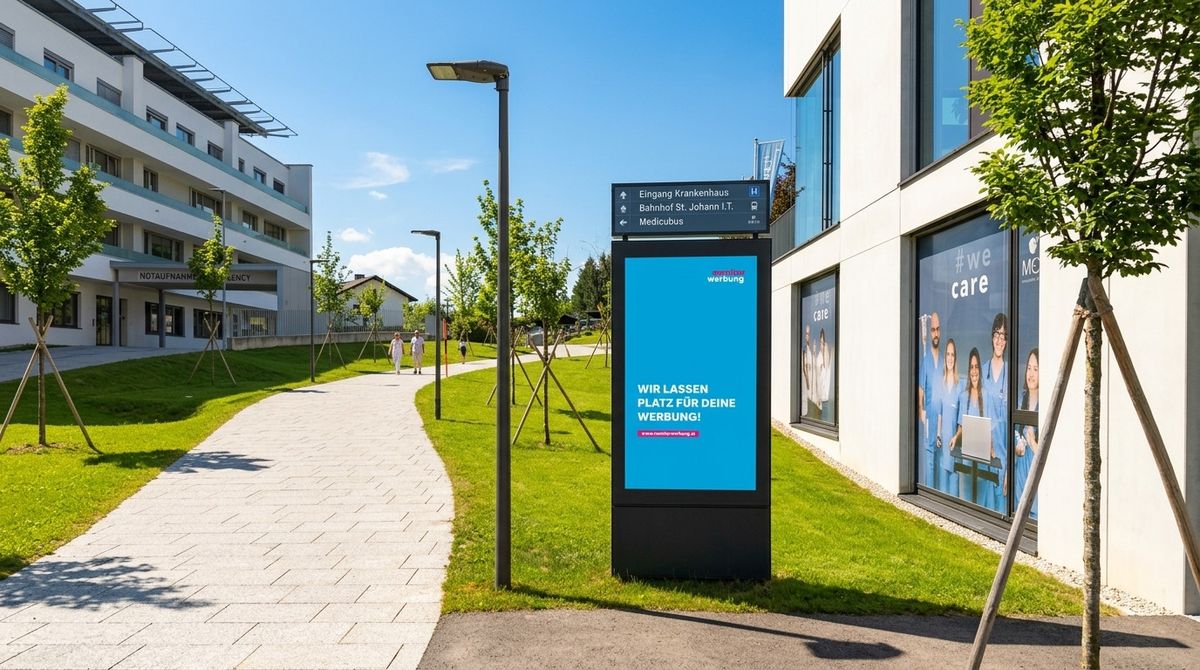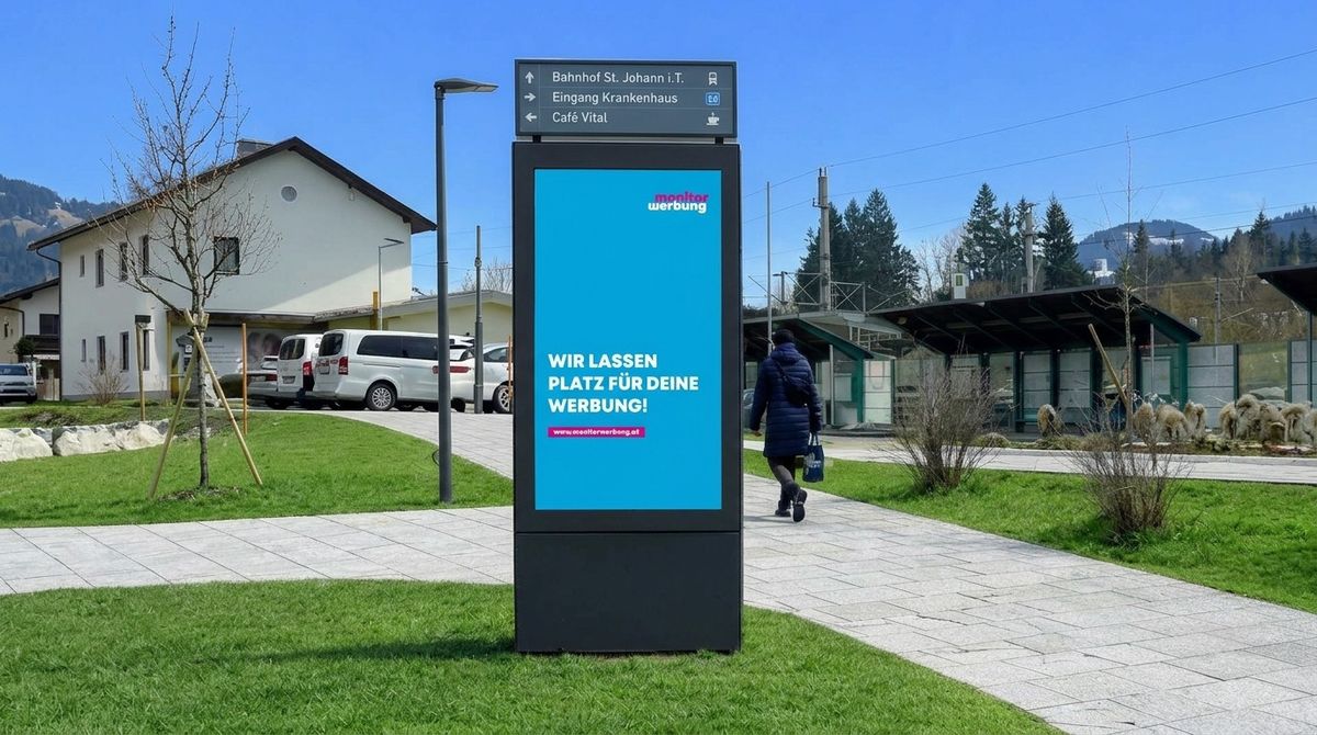 Die beiden doppelseitigen Outdoorstelen befinden sich in der Nähe des Bahnhofes sowie am Zugang in Richtung Ortszentrum.